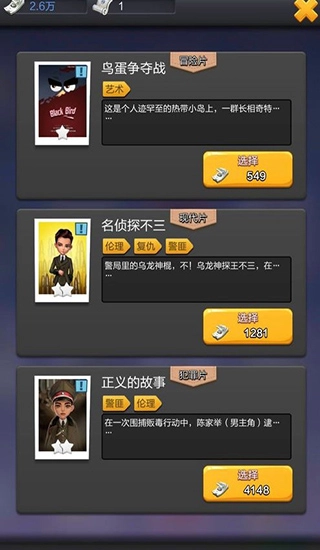 從經典港片到好萊塢大片,看過了那么多熒幕經典,你想親自重拍哪一部呢?游戲擁有海量劇本,愛情、動作、古裝、喜劇等各種類型一應俱全,經典大片任你挑選,熱映新片劇本不間斷上線,想拍什么電影,統統滿足你。