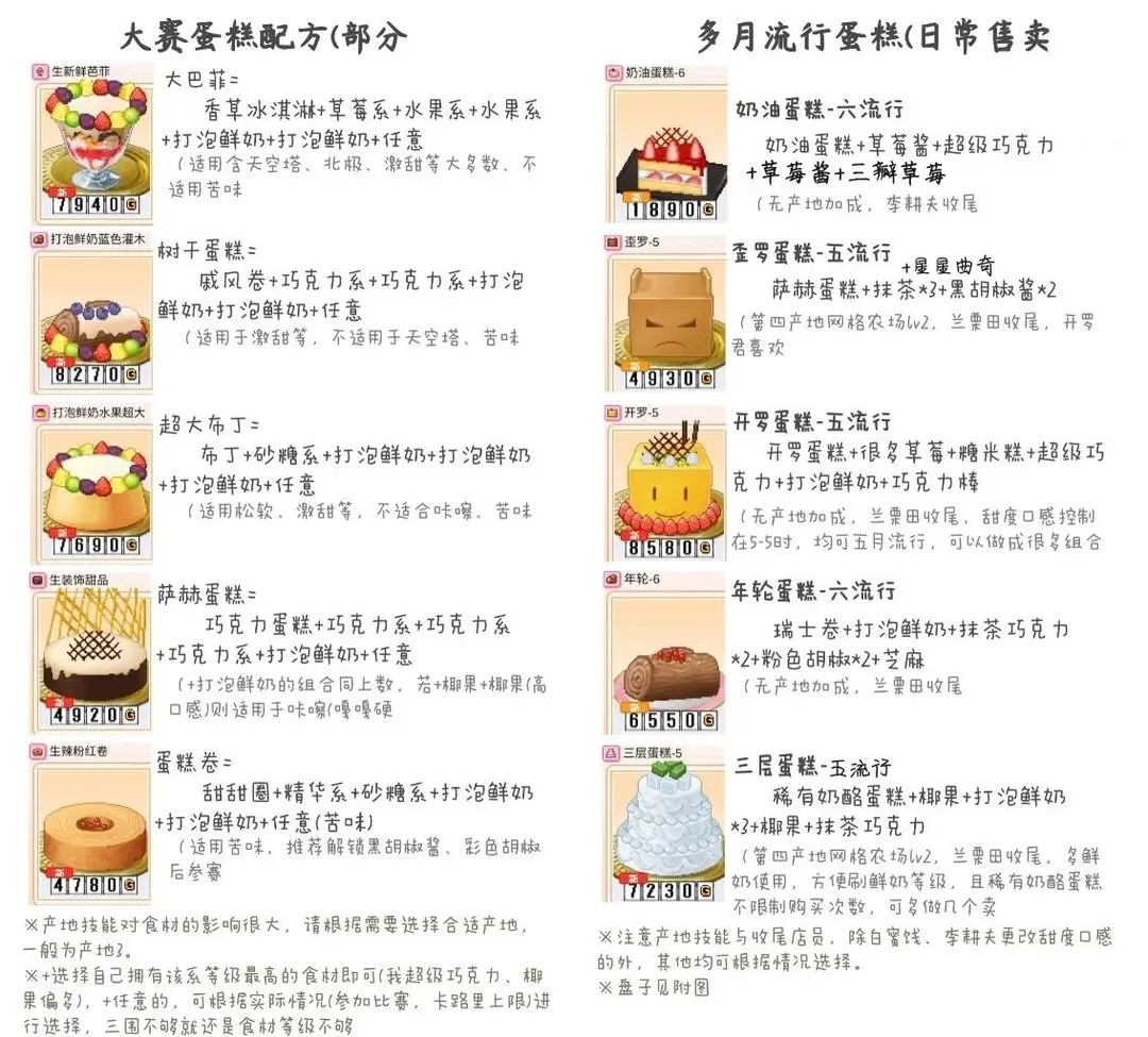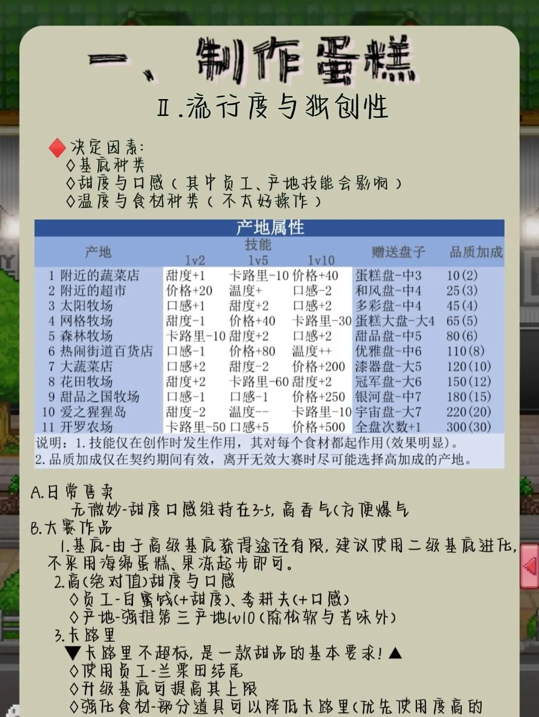 日常推薦第四產地(降甜度)和第五產地(減卡路里),技能僅在創作甜點時生效,品質加成則在契約期間持續發揮作用。選好合適的產地完成甜點創作后,記得回到品質加成最高的產地參加比賽,產地配方升級方式為:普通盤+果凍+打泡鮮奶×3