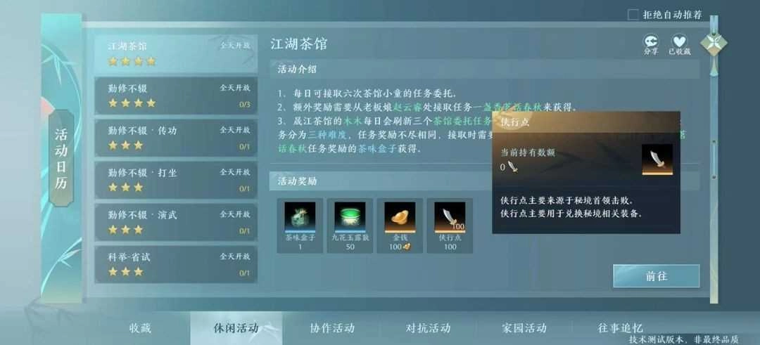 江湖茶館和秘境日常必做的原因在于完成任務后送的“俠行點”。前面也提到過俠行點可以換裝備搭配,而且很多俠行點換的裝備真的很好。
