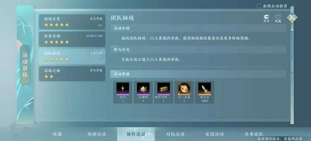 如果是PVE玩家,可以看看【協作活動】這一頁的部分內容,如【團隊秘境】以及【試煉之地】,這兩個都是打PVE裝備的好地方。如果團內有人拍裝備的話,大家還可以掙點金。