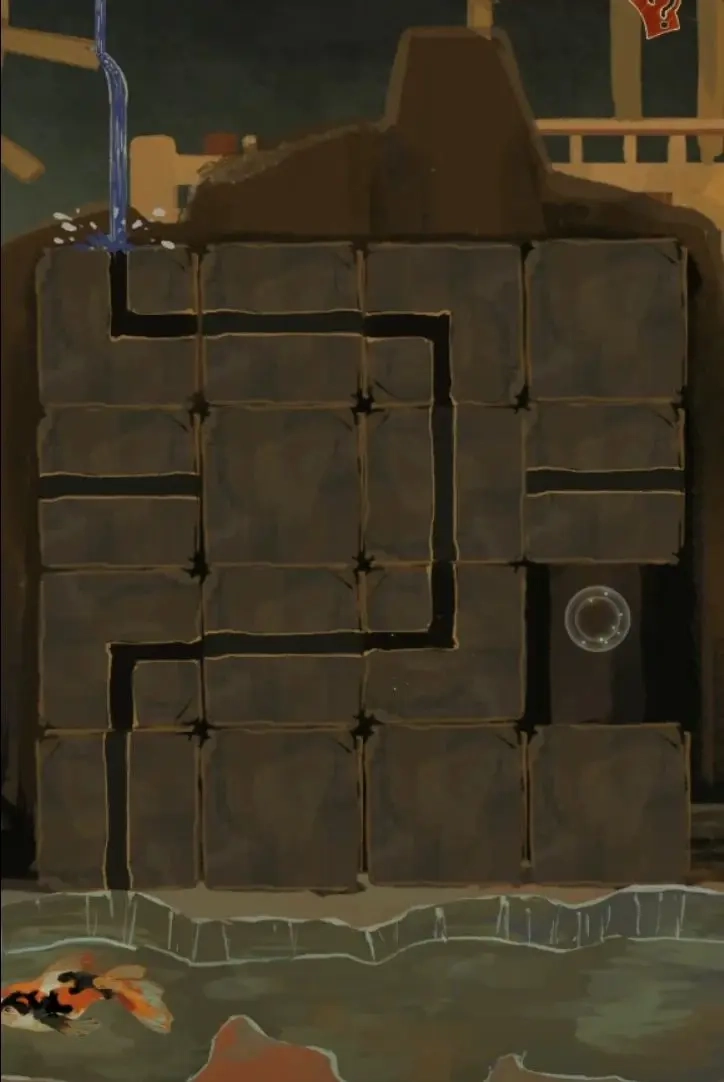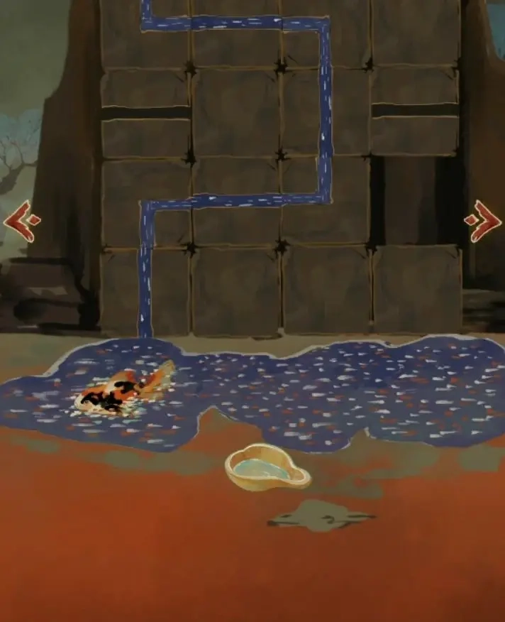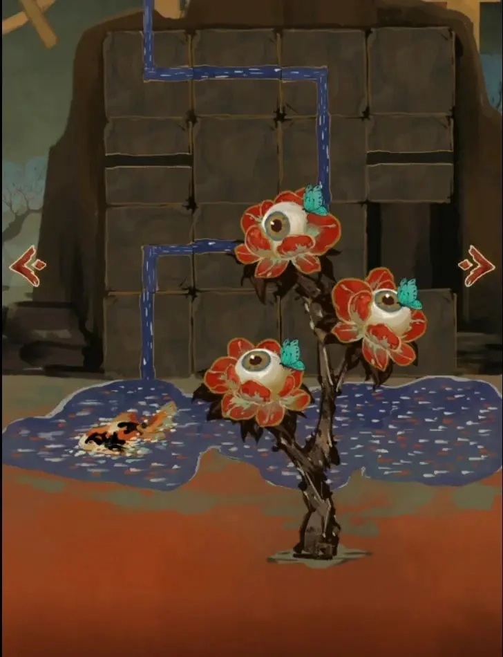 完成劇情后,從石碑的左上角、左下角和右下角各取一只螢火蟲(chóng)。右轉(zhuǎn)后點(diǎn)擊小貓咪觸發(fā)劇情,接著把三只螢火蟲(chóng)都放置在小貓咪身后的燈柱上,就能得到黃色顏料和一顆種子。隨后在左上角的葫蘆藤上取下一個(gè)葫蘆,繼續(xù)右轉(zhuǎn)到右下角拿到一把匕首。點(diǎn)擊錦鯉后方的石頭,會(huì)進(jìn)入米雪最討厭的移動(dòng)拼圖環(huán)節(jié)——不過(guò)這個(gè)關(guān)卡難度不高,只需讓水流連通到下方即可,這里附上一種相對(duì)簡(jiǎn)單的通關(guān)步驟截圖。