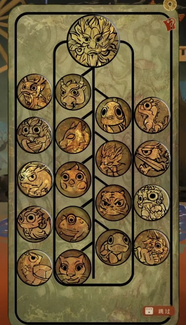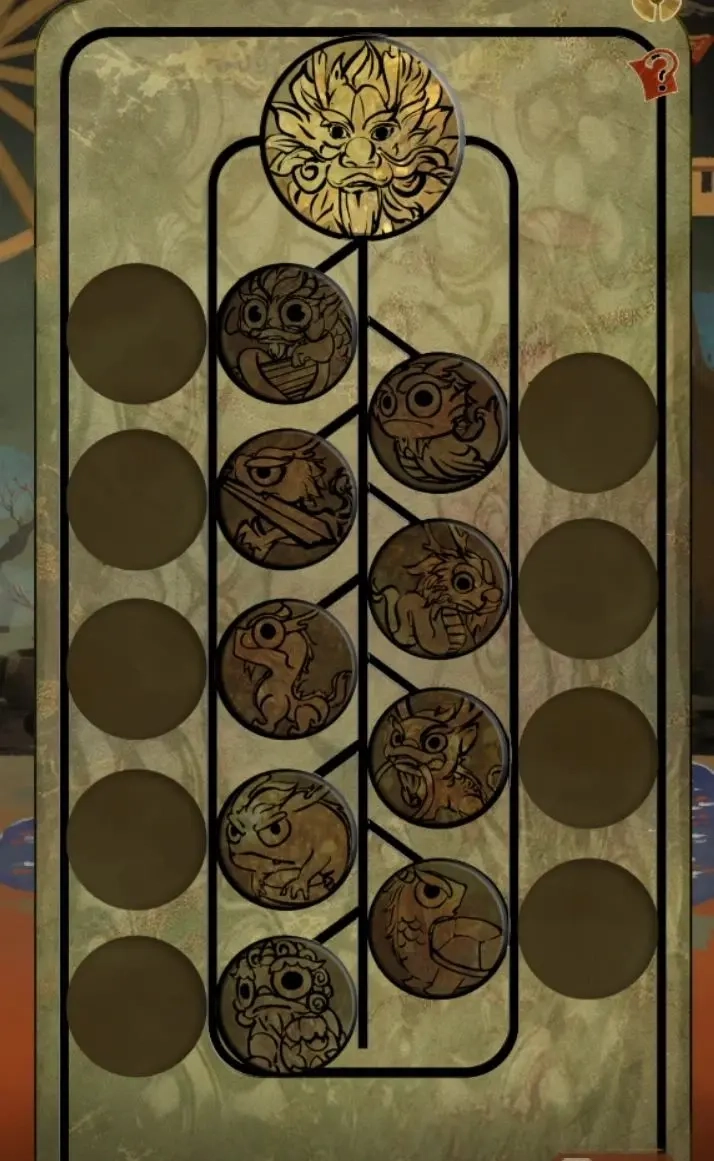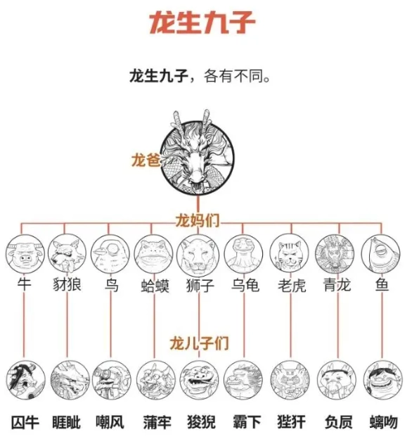 還有一種解法就是既然是龍生九子就看有哪些特征相同了,這不需要百度純推xia測(cè)meng即可,也是米雪最喜歡的揭秘方式,當(dāng)然窮舉法也是很棒啊這里米雪就不多說(shuō)了,按照特征第一個(gè)有帶橫紋的牛角,所以對(duì)應(yīng)左邊第二個(gè);第二個(gè)一看這嘴巴就是條魚(yú),這里面有魚(yú)的特征的就是左邊第四個(gè)有魚(yú)尾;第三個(gè)看起來(lái)像是狼特征不明顯暫時(shí)不動(dòng);第四個(gè)也是龍所以對(duì)應(yīng)右下角的龍;第五個(gè)看起來(lái)是鸚鵡也就是鳥(niǎo),但是沒(méi)有明顯有鳥(niǎo)類特征的暫時(shí)一放;第六個(gè)老虎沒(méi)有明顯相似的暫時(shí)一放;第七個(gè)蛤蟆,看這氣質(zhì)和大嘴巴肯定對(duì)應(yīng)的是左邊第三個(gè)了;第八個(gè)小烏wang龜ba龜殼都露出來(lái)了對(duì)應(yīng)左下角的;第九個(gè)獅子肯定對(duì)應(yīng)玩球的石獅子。這里我們還剩下第3個(gè)和第5個(gè)第6個(gè),看眼睛的話第5個(gè)和右上角的一樣呆滯的死魚(yú)眼,第六個(gè)和左上角眉形相似,然后把不好推斷的右邊第二個(gè)放在第三個(gè)位置就完成了。
