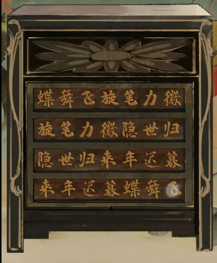 這次終于能左轉(zhuǎn)了,左轉(zhuǎn)后就進(jìn)入木頭人場(chǎng)景。木頭人身后有個(gè)可拖動(dòng)的柜子,本來(lái)打算找到線索再動(dòng)手,看來(lái)只能直接嘗試了。這里沒(méi)有任何提示,需要拖動(dòng)柜子上的詩(shī)詞來(lái)組成一首回文詩(shī),解法沒(méi)什么特別的,全憑個(gè)人理解。成功打開(kāi)后會(huì)得到一根糖畫(huà)。