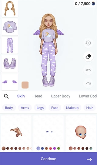 4、還可以為你的虛擬形象選擇不同風格的包包,裝飾完成后點擊底部“continue”箭頭!