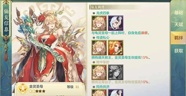 每位仙友一共有五個羈絆效果,其中一個羈絆是需要兩位仙友同時上陣觸發(fā)效果,另外四個羈絆是同時擁有即可觸發(fā)羈絆效果,因此收集的仙友越多,解鎖的羈絆也就越多,提升整體實力也就越強。