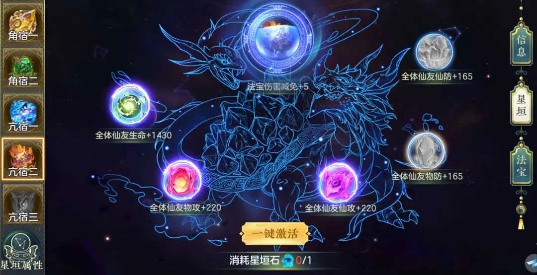 1、主角除了需要提升境界外,還有星垣和法寶系統(tǒng),我們可以通過主線游歷來獲取星垣石,激活星垣,不同的星垣提升的屬性也不一樣,有加攻擊、生命、防御、傷害減免等屬性,這些屬性會加給主角、仙友、法寶身上。