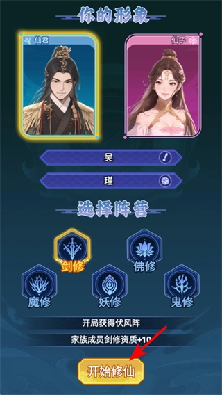 1、在形象與陣營選擇界面,選定形象與陣營后,點擊開始修仙可開啟修仙玩法,這是進入仙途、建立家族勢力的基礎操作。