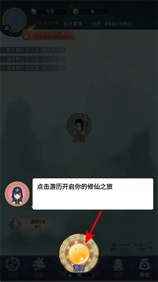 2、進入主界面后,點擊游歷按鈕可開啟修仙探索流程,這是獲取資源、觸發事件的核心操作,持續游歷能推進仙途進度、解鎖更多玩法內容。
