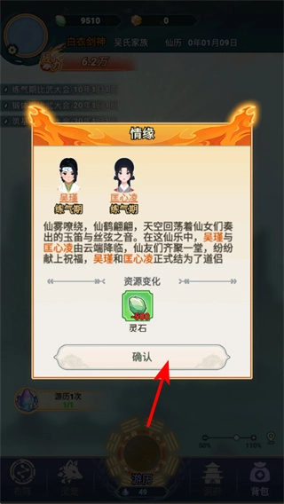 4、情緣事件完成后,點擊確認可結算事件獎勵,鎖定當前的情緣關系,鞏固仙途社交、積累發展資源的前置操作,助力后續家族勢力的壯大。