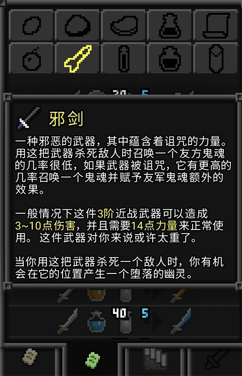 3、邪劍,是個挺有意思的武器。它的效果觸發(fā)判定機(jī)制不是靠用它擊殺實體,而是只要這把劍在你手上,所有實體死亡后都會觸發(fā)判定。強(qiáng)化次數(shù)越多,判定成功率就越高,至于強(qiáng)化到多少能百分百觸發(fā),我也不清楚——我用賭徒把它加到50時是百分百觸發(fā)的,但其實沒必要,畢竟這武器能百分百觸發(fā)后,玩法就不再是近戰(zhàn)敲人了。之前提到過,持有該武器時所有實體消亡都會觸發(fā)判定,這里推薦可以搭配哨衛(wèi)法杖使用:哨衛(wèi)本身也是實體,當(dāng)哨衛(wèi)釋放激光后自動消亡時,同樣會經(jīng)過邪劍的判定,也就是說可以手動刷小弟,配合術(shù)士使用效果會更好。當(dāng)然,這只是賭徒挑戰(zhàn)的娛樂玩法罷了,沒什么含金量,感興趣的話可以試試。