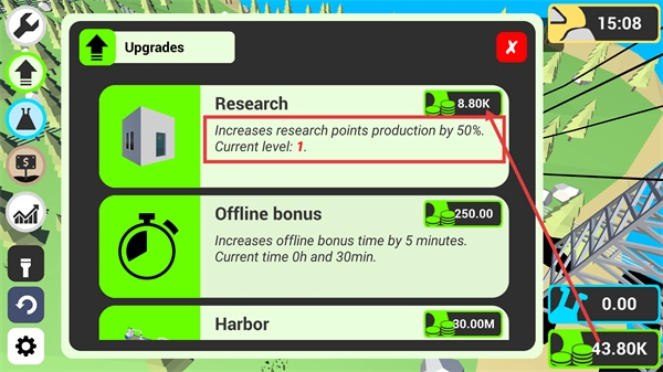 1、進入【Upgrades】界面后,優先選擇【Research】升級項,消耗8.80K-資源,能將研究點產量提升50%,當前等級為1,可助力科技解鎖。