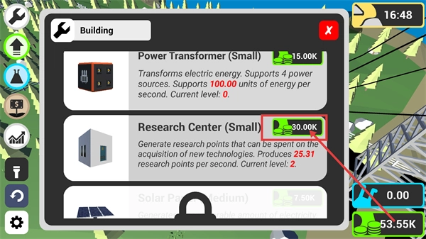 2、在【Building】界面,解鎖【Research-Center-(Small)】需消耗30.00K-資源,其每秒產25.31-研究點,當前等級為2,強化研究效率。