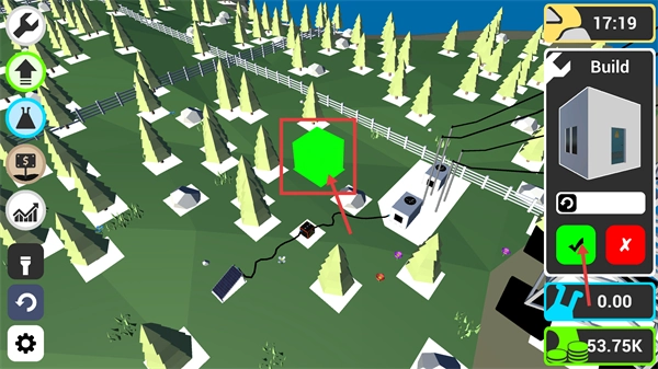 3、進入建造界面,選定建筑后定位綠色區域,點擊右側綠色對勾按鈕完成建造,當前53.75K-資源可支撐該操作。