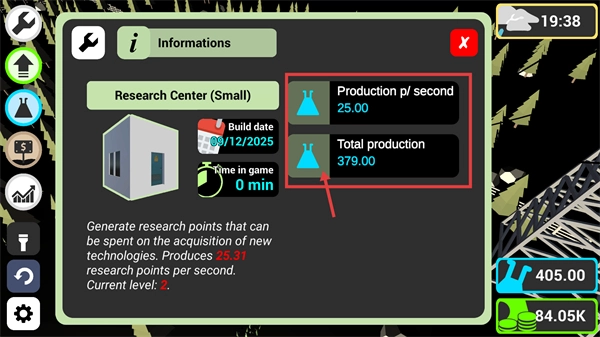 4、打開【Informations】界面,查看【Research-Center-(Small)】數據,其每秒產25.00-研究點,總產量達379.00,掌握設施產出狀態。