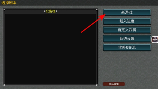 在游戲主界面,點擊“新游戲”按鈕即可進入劇本選擇環(huán)節(jié),這是開啟三國策略玩法的基礎操作,后續(xù)需通過挑選劇本、經(jīng)營領地來推動勢力發(fā)展。