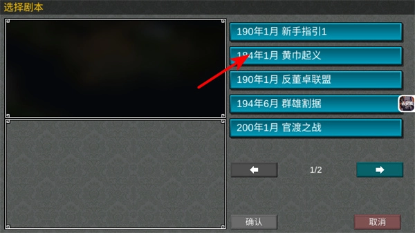 2、進入劇本選擇界面后,選擇對應歷史劇本如184年1月黃巾起義,這是確定游戲時代背景、開局條件的核心操作,不同劇本對應不同戰(zhàn)略環(huán)境。