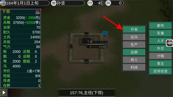 3、進入領地界面后,點擊開發(fā)可進入城池建設界面,這是提升領地資源產(chǎn)出如兵力、錢糧的關鍵操作,持續(xù)開發(fā)能強化領地的經(jīng)濟與軍事基礎。