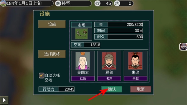 4、在設施建設界面,選擇武將如吳國太負責領地開發(fā),點擊確認可完成建設指令,合理分配武將能力如仁政、能提升開發(fā)效率,加速領地成長。