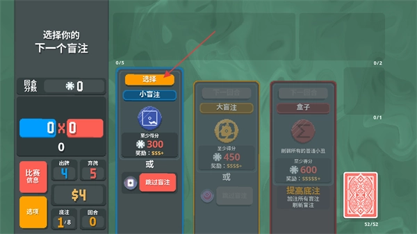 3、處于選擇你的下一個(gè)盲注環(huán)節(jié)時(shí),點(diǎn)擊選擇小盲注參與盲注,也能選跳過(guò)盲注推進(jìn)游戲。