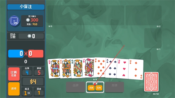 4、進(jìn)入出牌階段后,選擇手牌點(diǎn)擊打牌可選點(diǎn)數(shù)/花色,也可通過(guò)出牌、棄牌操作推進(jìn)回合。