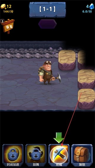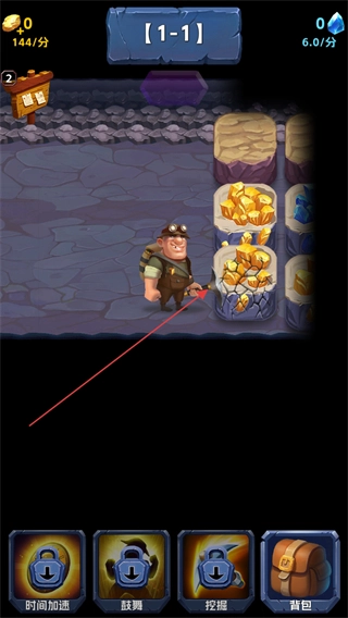 1、在1-1關卡中,點擊礦石堆,操控礦工開采資源,積累金幣與鉆石。
