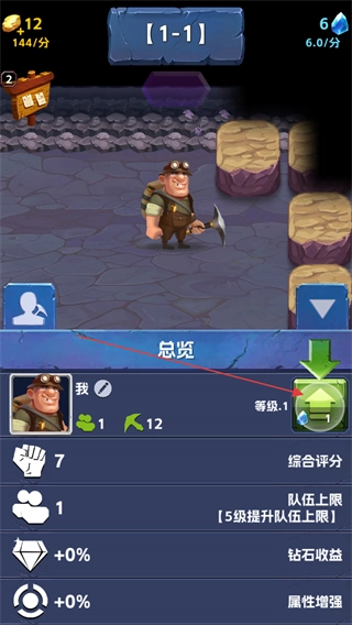 2、打開總覽界面,消耗鉆石提升角色等級,增強開采相關屬性。