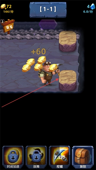 4、使用挖掘技能后,礦工開采礦石獲得+60金幣,持續積累資源推進關卡。