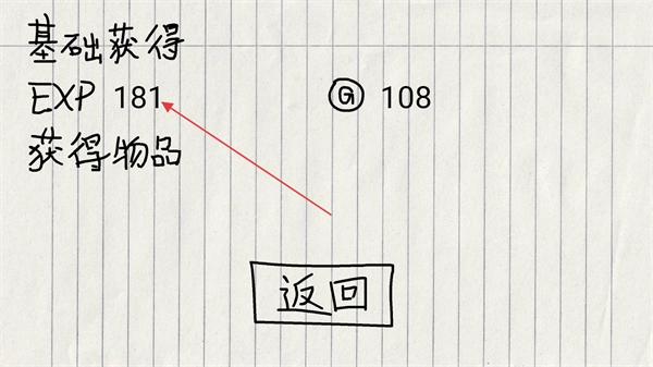 1、這是通關后的獎勵界面,界面上顯示了基礎獲得的181點EXP和108單位的貨幣,點擊界面中的返回按鈕,就能回到游戲主界面繼續進行后續操作。