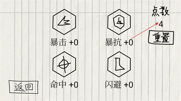 3、這是屬性加點界面,當前可用點數4,包含暴擊、暴抗、命中、閃避等屬性選項,可點擊屬性進行加點。
