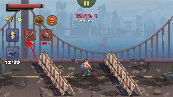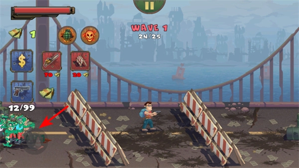 4、持續(xù)擊敗僵尸后,觀察上方的擊殺計數(shù)與資源數(shù)值變化,當武器欄中的道具可升級時,應(yīng)對后續(xù)更強僵尸波次的重要操作。