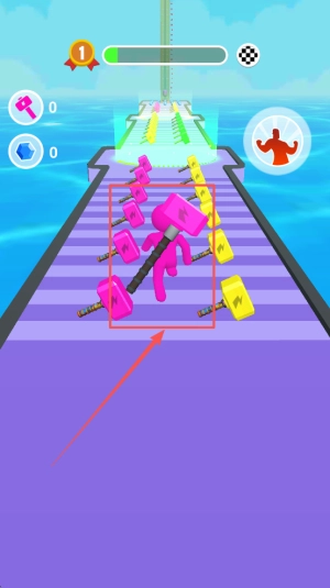2、賽道奔跑合成玩法:玩家操控角色在賽道上靈活穿梭,收集場景里的錘子道具,通過精準合成相同顏色的錘子,使其尺寸和威力得到提升。