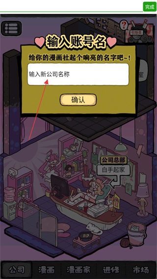 3、在游戲的初始環節,需在輸入框中填寫漫畫社名稱,完成后點擊確認按鈕,即可進入游戲主界面。