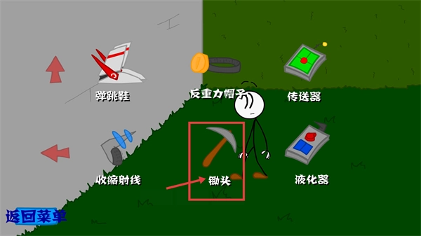 1、打開道具選擇界面,選中被紅色框標(biāo)記的【鋤頭】道具,此道具能夠用來挖掘、破壞場景里的障礙,是推動當(dāng)前關(guān)卡進度的關(guān)鍵工具。