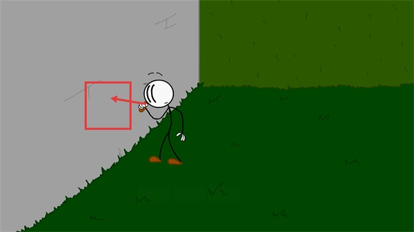 2、操控火柴人使用鋤頭,交互紅色框標(biāo)注的墻壁區(qū)域,通過挖掘該區(qū)域打開新通道,進入后續(xù)場景。