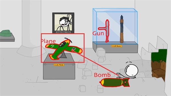 3、進入展廳場景后,關(guān)注紅色框標(biāo)注的【Plane飛機模型】,結(jié)合場景內(nèi)的【Bomb炸彈】等物品,后續(xù)可借助這些道具完成場景交互目標(biāo)。