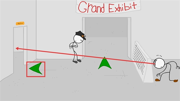 4、在展廳場景中,使用紅色框標(biāo)注的【綠色箭頭道具】,該道具可指引方向或觸發(fā)門的開啟,借助它向左側(cè)門推進,完成該環(huán)節(jié)關(guān)卡流程。
