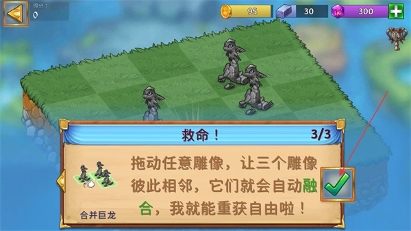 3、查看書中的故事,按照指引拖動任意雕像,使三個雕像彼此相鄰,它們會自動融合,這是該關卡的核心操作方式。