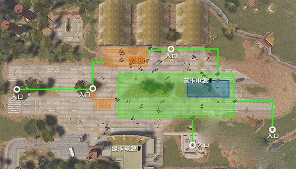 2、機(jī)場:位于地下,不過得放置2個(gè)保險(xiǎn)絲。圖里的藍(lán)色和綠色區(qū)域都藏有補(bǔ)給,綠色區(qū)域能用綠卡打開,藍(lán)色區(qū)域則需要藍(lán)卡,橙色區(qū)域可以直接進(jìn)入。
