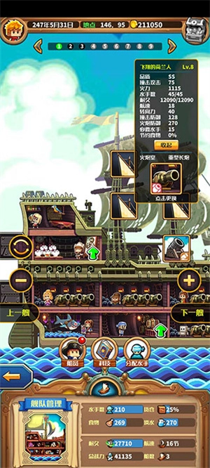 2、火炮室和引擎室都要升滿,水手室建議升到3-4級(提醒一下,當前版本升級船體不會增加必要的水手數量,但升級水手室是會提升的;如果是肉搏船的話就直接拉滿)。廚房可以根據自己的情況來決定升不升級,船長室有條件就盡量升級。至于倉庫……總覺得從7級升到8級不太劃算,不過這一點和外傳的設定不太一樣……