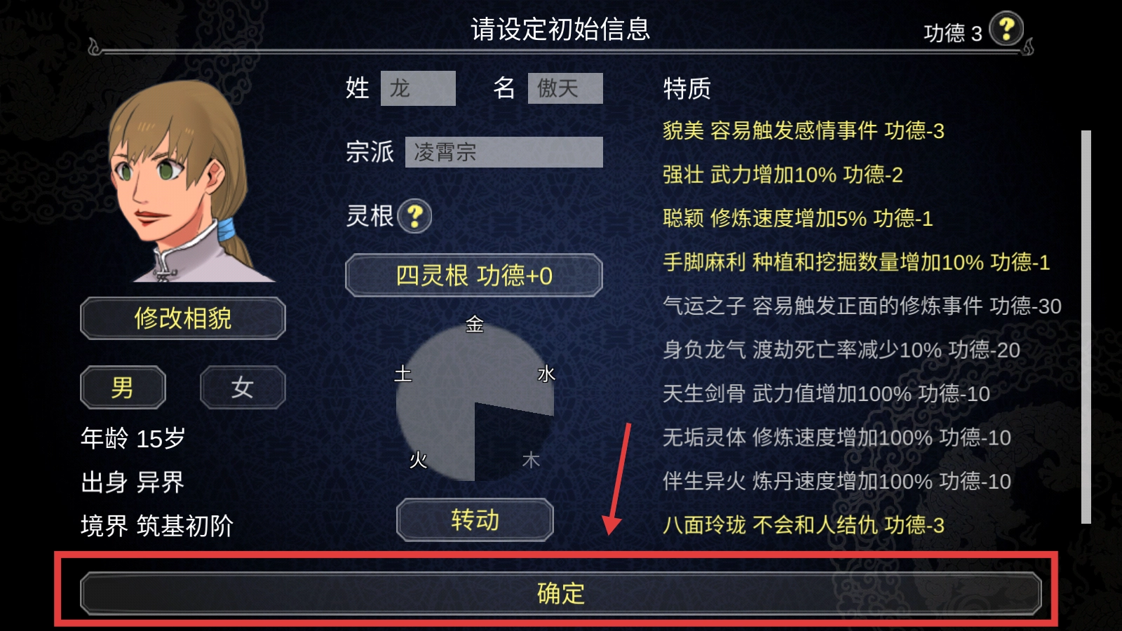 1、設置姓名「龍傲天」、宗派「凌霄宗」等初始信息,核對無誤后點擊確定,即可開啟宗門修煉之旅。