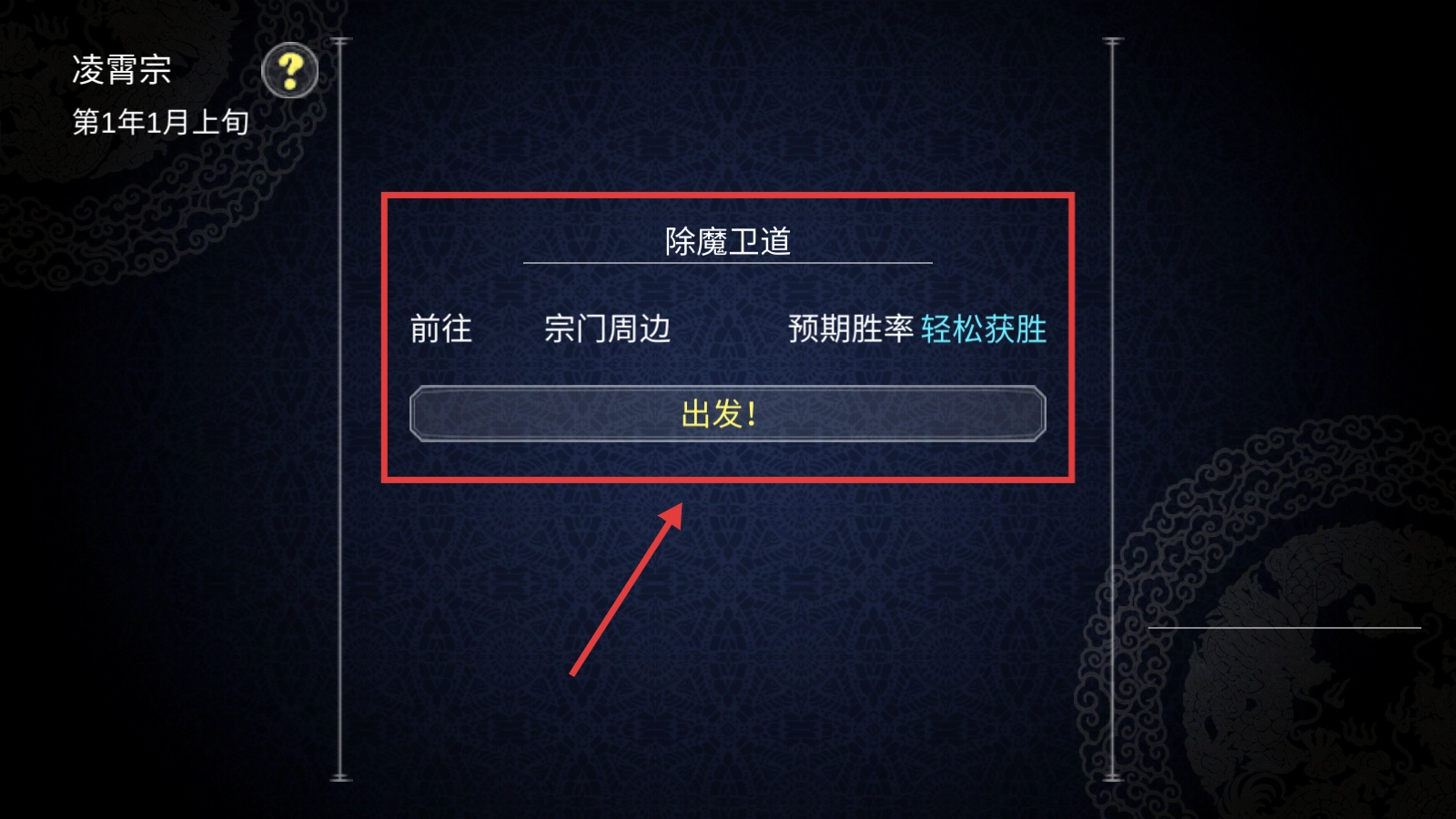 2、進入除魔衛道任務界面,選擇前往【宗門周邊】,預期勝率輕松獲勝時點擊出發,獲取初始資源。