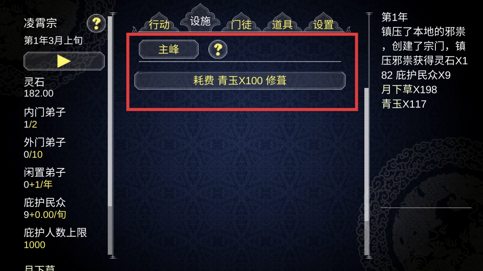 4、積累足夠青玉后,進入主峰界面,消耗【青玉X100】修繕,提升宗門基礎功能與實力。