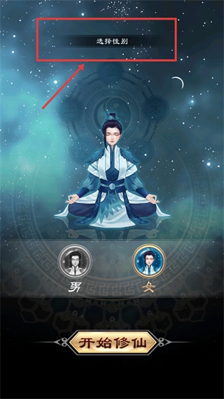 進(jìn)入游戲后,首先需要完成【選擇性別】的設(shè)置,在【男】和【女】?jī)蓚€(gè)選項(xiàng)中選定其一,隨后點(diǎn)擊【開始修仙】按鈕,就能正式開啟你的修仙之旅了。