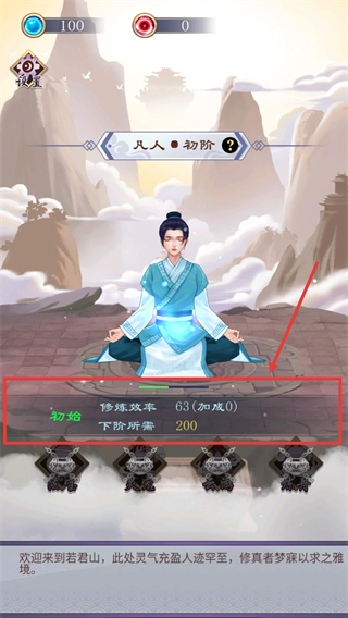 2、進(jìn)入修煉界面后,查看【凡人】-【初階】的狀態(tài),留意修煉效率以及下階所需靈氣數(shù)值的積累情況,同時(shí)關(guān)注突破所需的資源。