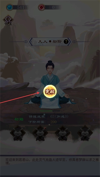 3、當(dāng)靈氣積累達(dá)到下一境界所需的數(shù)值時(shí),點(diǎn)擊角色旁的【突破】按鈕,即可嘗試提升自身的修煉境界。
