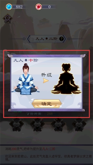4、突破成功后會(huì)彈出【凡人】-【二階】的升級(jí)提示框,點(diǎn)擊【確定】按鈕即可完成境界提升流程。