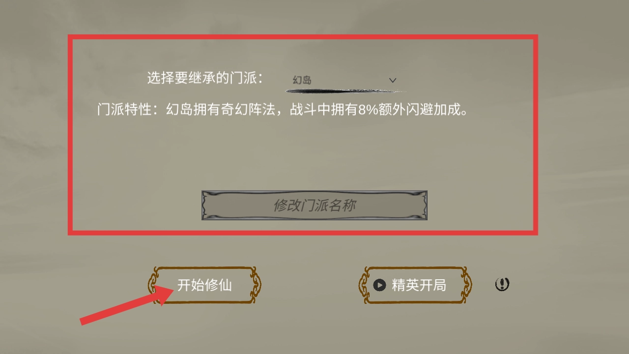 3、玩家需先在方框內自行選擇要繼承的門派,接著完成取名操作,最后點擊【開始修仙】按鈕,就能進入游戲開始游玩了。