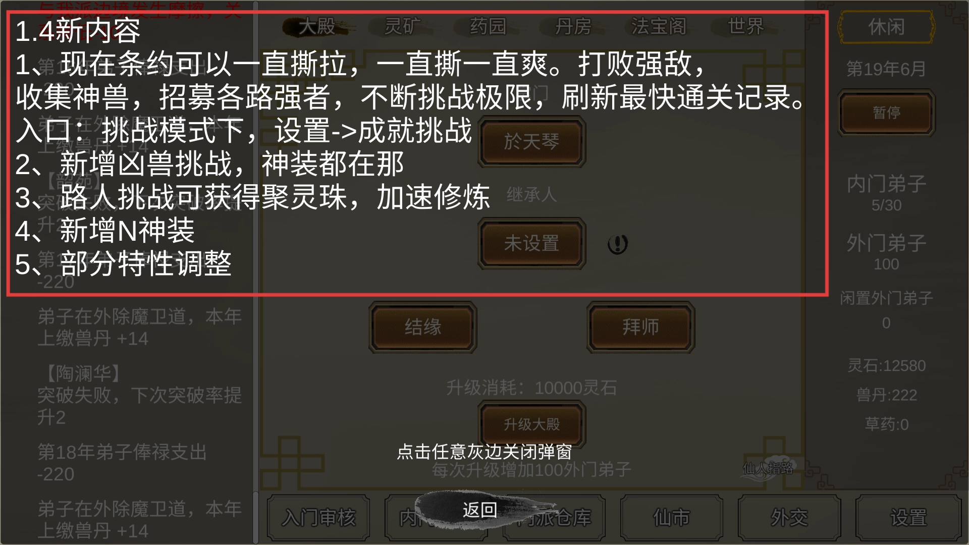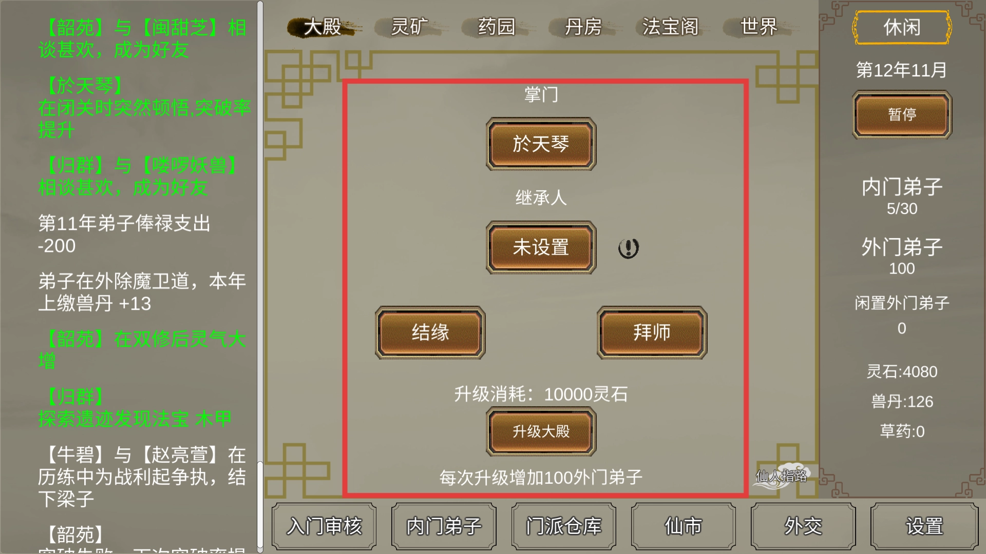 1、在【大殿】界面,可設置【繼承人】,通過【結緣】-【拜師】提升弟子關系,積累【靈石】升級大殿增加外門弟子數量。