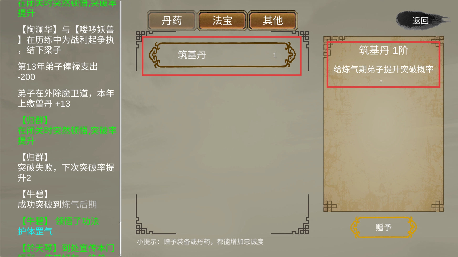 2、在【丹藥】界面選擇【筑基丹】,將其贈予煉氣期弟子,能有效提升弟子突破瓶頸的概率,助力弟子快速成長。
