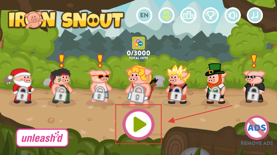 1、進入游戲主界面后,點擊中間的綠色按鈕開始戰斗,界面顯示總擊打次數為【0】比【3000】,多個小豬角色待解鎖,準備開啟對抗狼群的冒險。